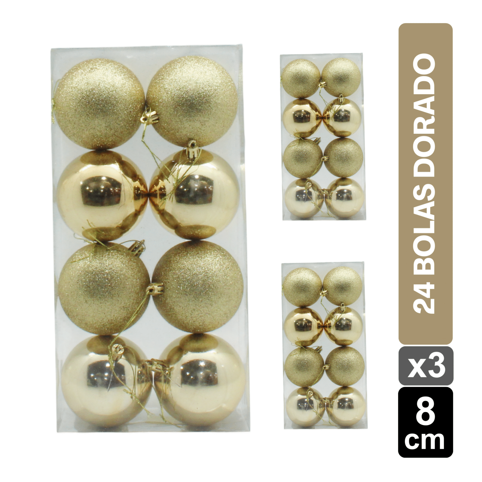 Aporta brillo y estilo a tu hogar con este Set de 24 bolas navideñas dorado de 8 CM. Con un acabado brillante y escarchado (BRI-ESC), estas esferas son perfectas para la decoración del árbol de Navidad, guirnaldas o centros de mesa. Su tonalidad dorado combina fácilmente con adornos dorados, plateados, rojos o champaña, creando un ambiente festivo y elegante.