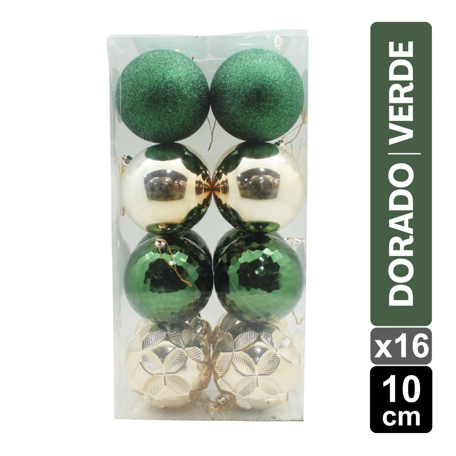 SET X 16 BOLAS NAVIDEÑAS SURTIDO DORADO/VERDE 10CM