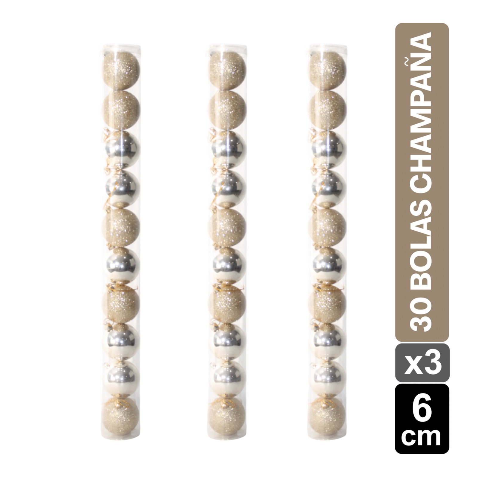 TUBOS BOLAS NAVIDEÑAS X30 CHAMPAÑA BRILLANTE/ESCARCHADO 6 CM