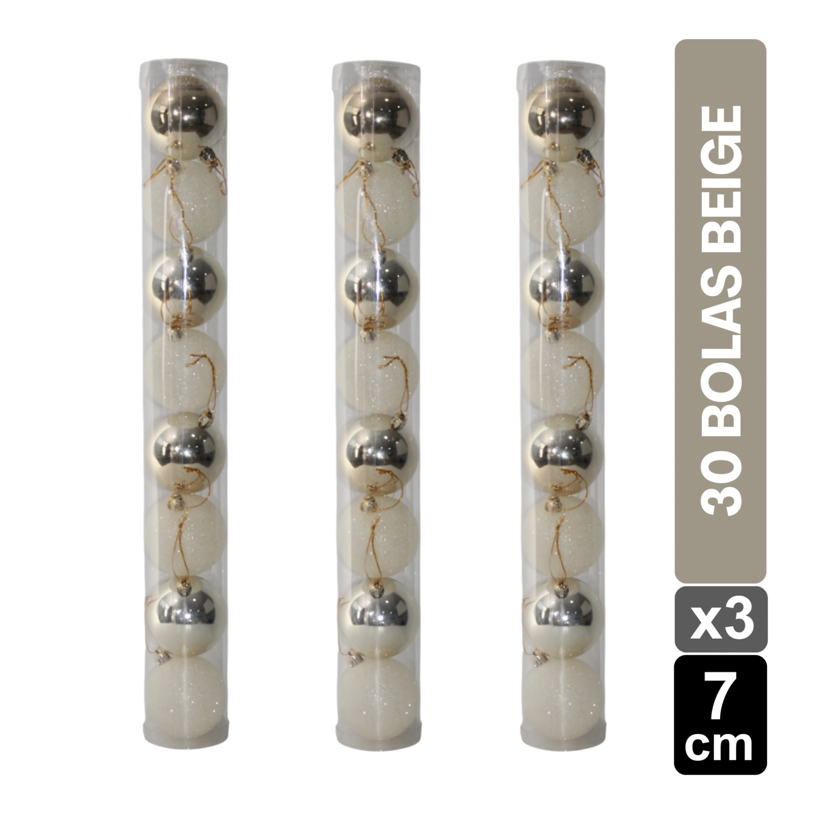 Aporta brillo y estilo a tu hogar con este set de bolas navideñas beige de 7 CM. Con un acabado brillante y escarchado (BRI-ESC), estas esferas son perfectas para la decoración del árbol de Navidad, guirnaldas o centros de mesa. Su tonalidad beige combina fácilmente con adornos dorados, plateados, rojos o champaña, creando un ambiente festivo y elegante.